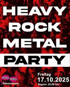 Am Freitag, den 17. Oktober 2025, heißt es im Kling Klang Wilhelmshaven: pure Energie, rohe Riffs und metallische Hymnen! Eine Nacht für Fans von Heavy Rock, Classic Metal, Thrash und modernen Härtegraden – laut, düster und kompromisslos. Ob Judas Priest, Metallica oder Parkway Drive – wir liefern den Soundtrack für Headbanger und Nachtschwärmer gleichermaßen.