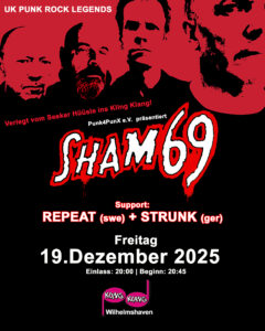 Die legendäre UK Punk Band SHAM69 kommt ganz kurzfristig ins KLING KLANG nach Wilhelmshaven.